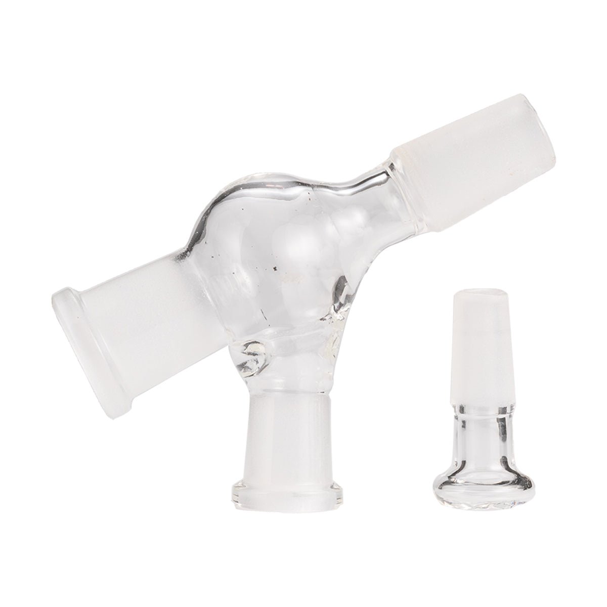 This glass adapter connects a 14mm male connection to any 14mm female fitting, but with a third multi-purpose female side joint.