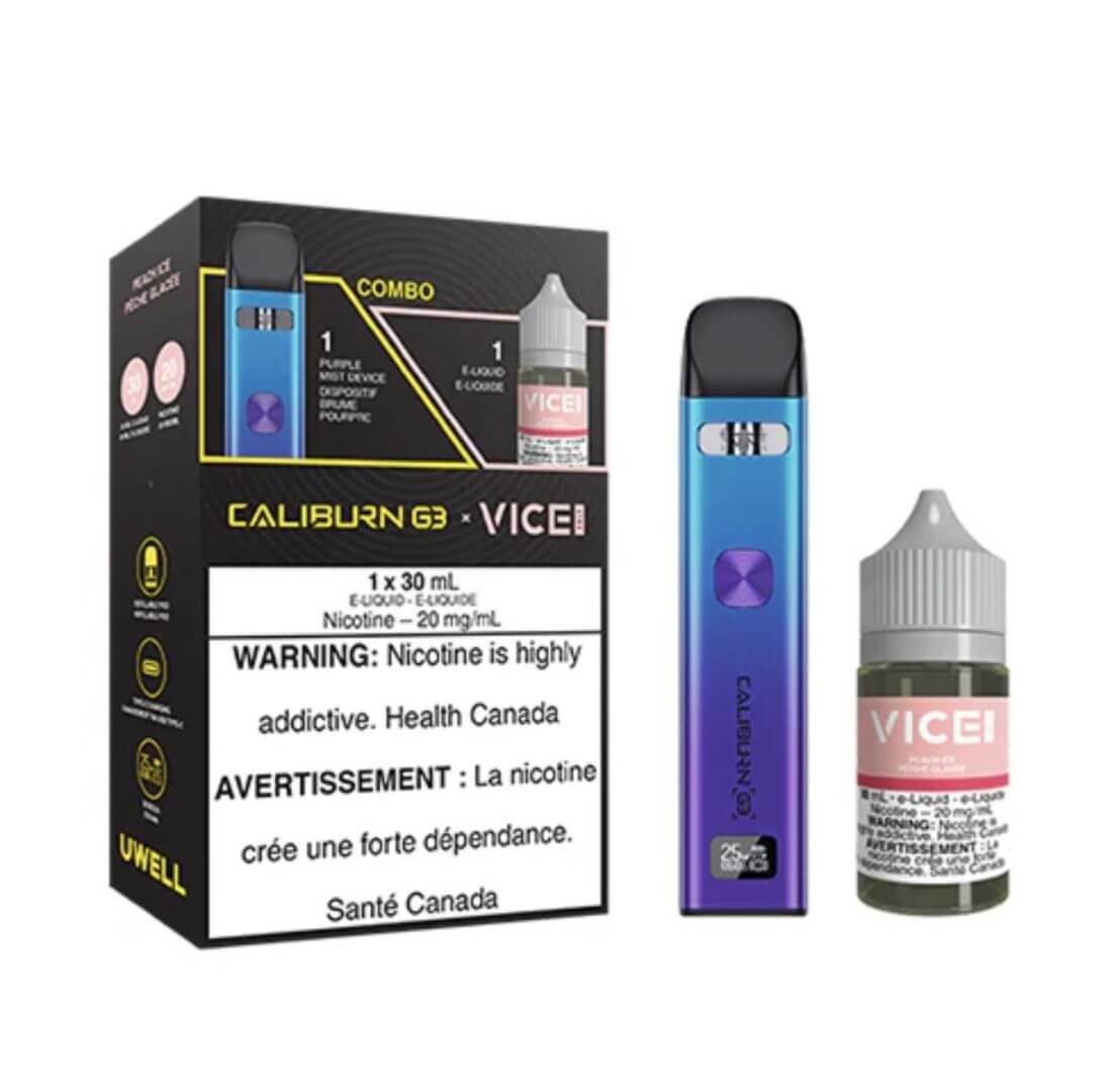 VAPEVINE SUMMARY: Caliburn G3 Citrus Wave Kit (Aqua/Yellow device) with Lemon Drop Blue Raspberry Salt or get the Caliburn G3 Purple Mist Kit (Purple/Blue device) with VICE Peach Ice Salt bottle.