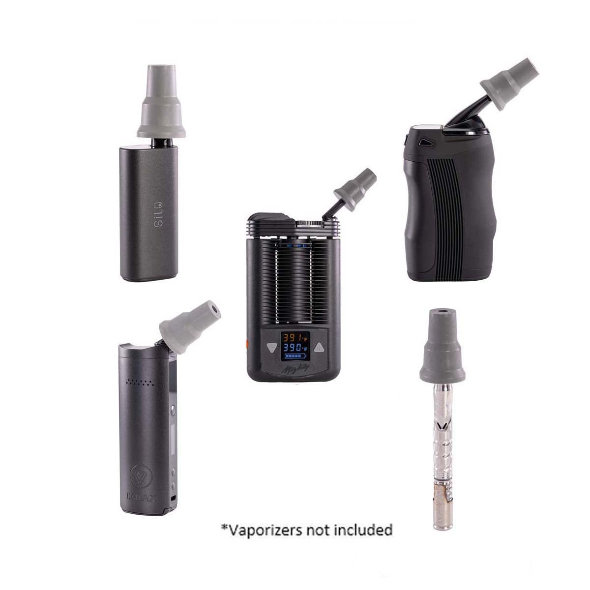 The Nearly Universal Water Pipe Adapter has 14mm and 18mm male fittings to connect to a variety of glass water pieces, and a flexible insert that’ll slip onto almost any vaporizer mouthpiece we carry.